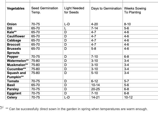 • A nifty vegetable chart from Iowa State University listing the ideal germination temperature range, the light requirements for newly planted seeds, days to germination, and the number of weeks it takes to go from sowing the seed to outdoor planting for 17 varieties of veggies and herbs.