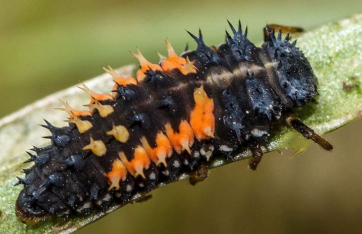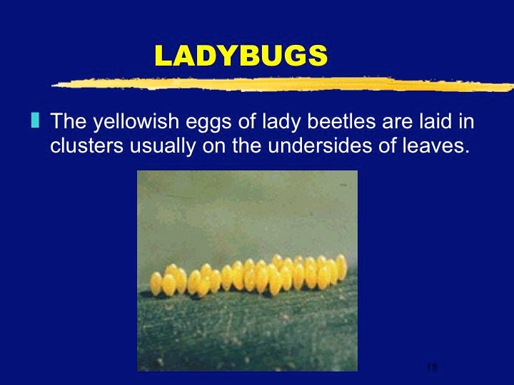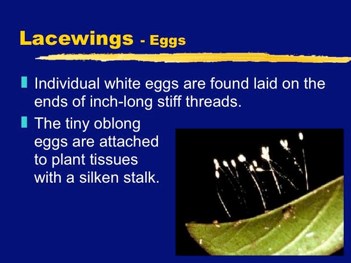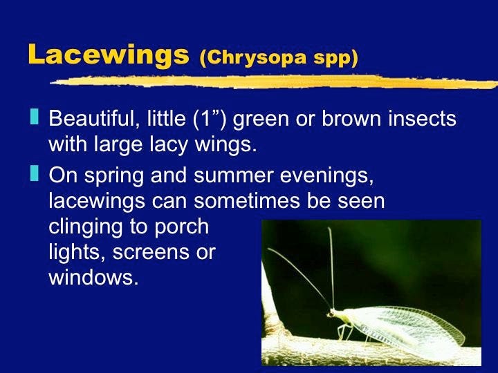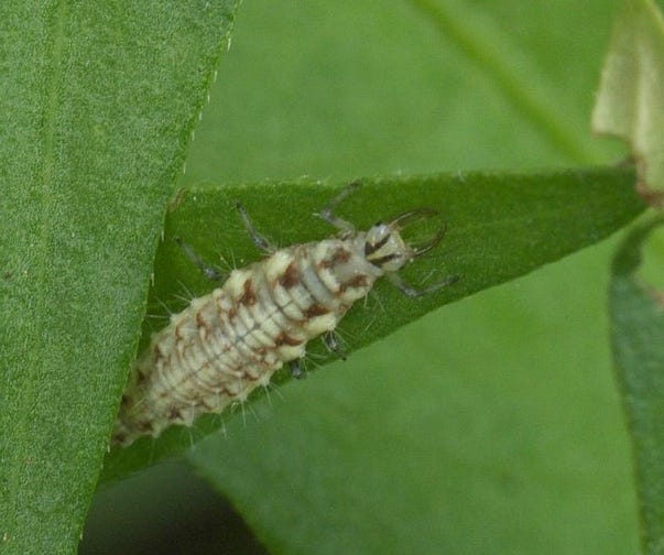Many of the "bad bugs" are actually the larval stage of "good bugs." The syrphid fly larvae look like tiny green worms, and the larvae of lacewings and lady beetles look almost like tiny alligators. Larvae eat the most aphids!