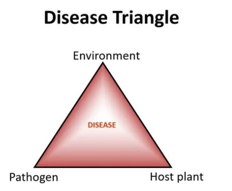Turns out, the same sort of triangle can help you figure out how to control plant diseases in the garden. Debbie Flower, America’s Favorite Retired College Horticulture Professor, calls it “The Disease Triangle”. Debbie says, “If you know this, you can control diseases without chemicals.”