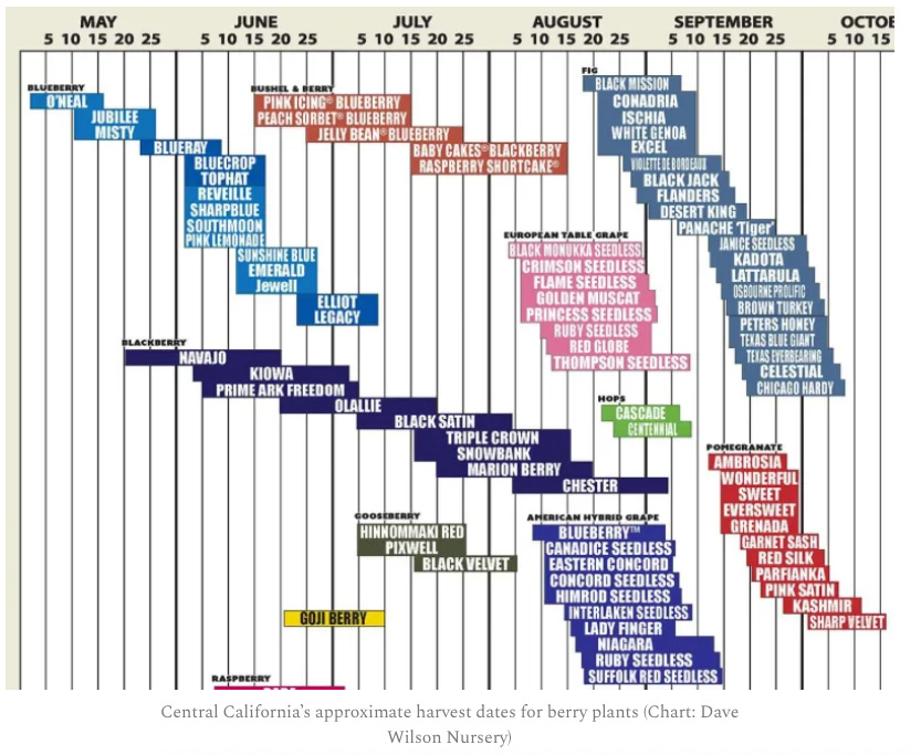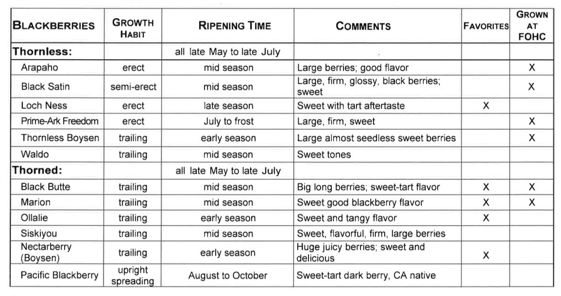To prolong the blackberry harvest, plant several varieties with differing harvest periods, perhaps Navajo, Kiowa or Prime Ark Freedom for early ripening; Olallie and Black Satin for mid-season; and Marion Berry and Chester for late ripening blackberry varieties. The ripening times on this chart represent varieties growing in the California Central Valley. Your results may vary by a few weeks.