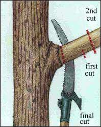 When pruning larger branches, use the three-cut method to prevent the falling branch from stripping the bark, below the cut.