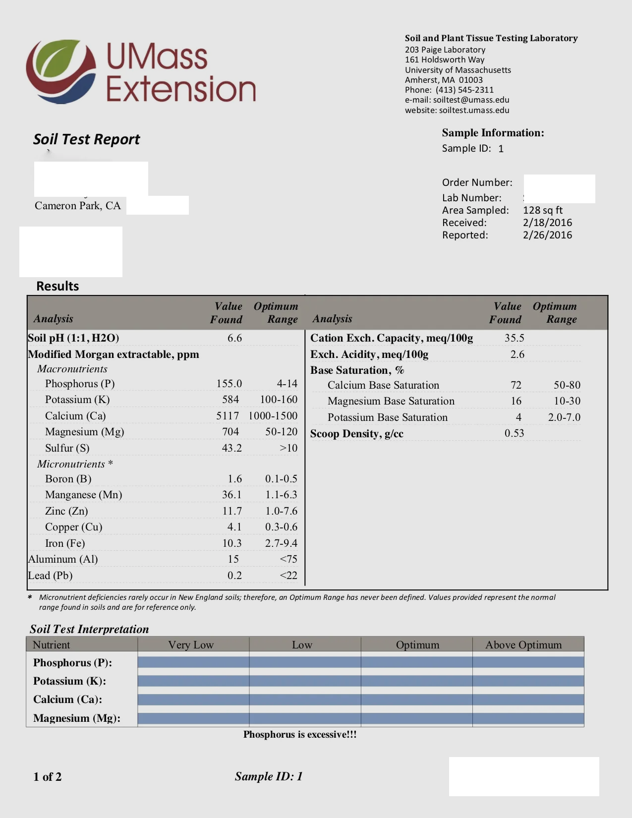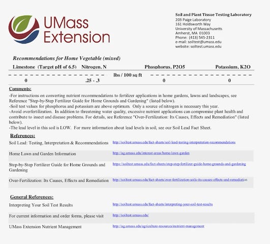 Soil Test Results for a Backyard Landscape from UMass/Amherst (Pgs 1 & 2)